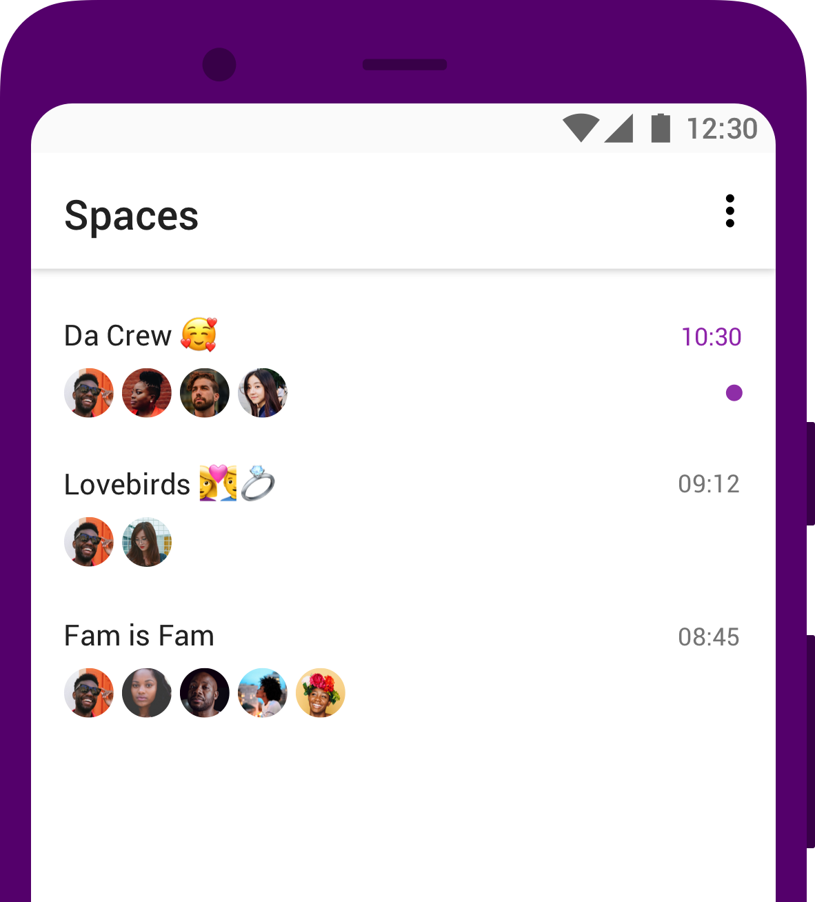 - Each row displays the following data about the chat: its name, list of members (as avatars), whether it has unread messages, and the date of the last message within it.